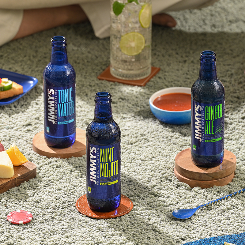 Your Cocktail Mixer for a Full House Party with Jimmy's Sparkling mixers of Ginger Ale, Tonic Water & Mint Mojito.