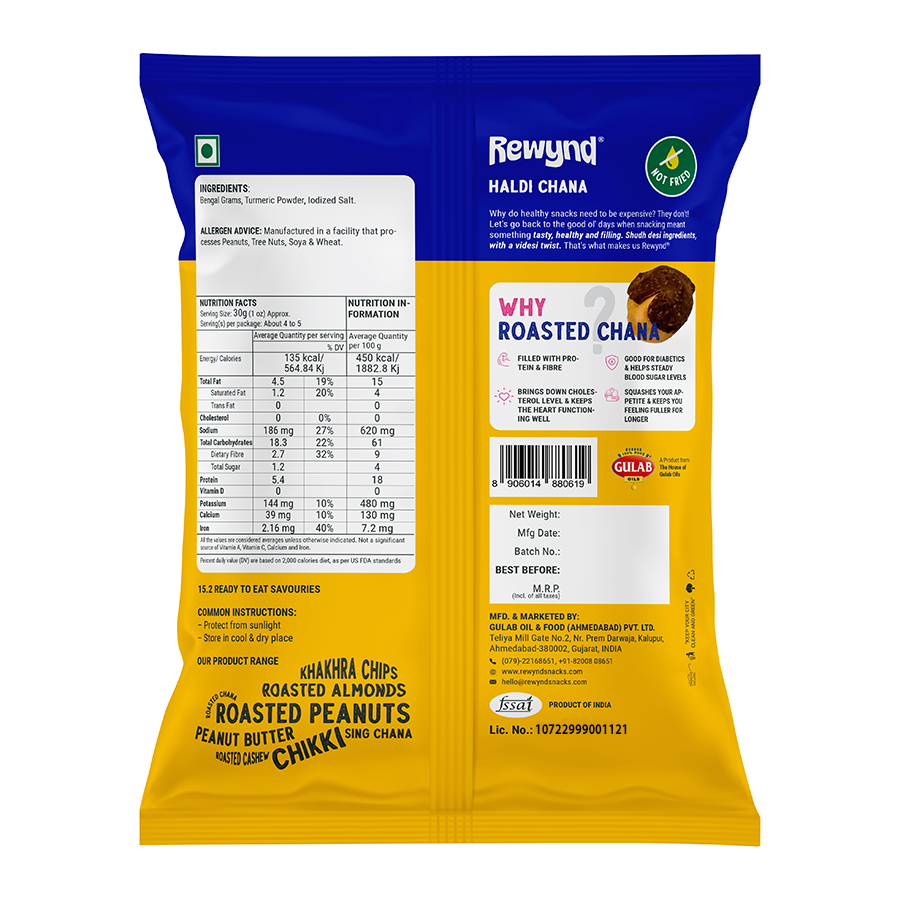 Get ready to ignite your taste buds with Rewynd's Haldi Chana! This quirky snack combines the goodness of haldi (turmeric) with the power-packed chana (chickpeas) for a double dose of superfood magic. It's like a party in your mouth with a golden twist! Indulge in the vibrant flavors and health benefits of Haldi Chana, because who said snacking can't be both delicious and supercharged? Let the golden goodness brighten up your snack time!